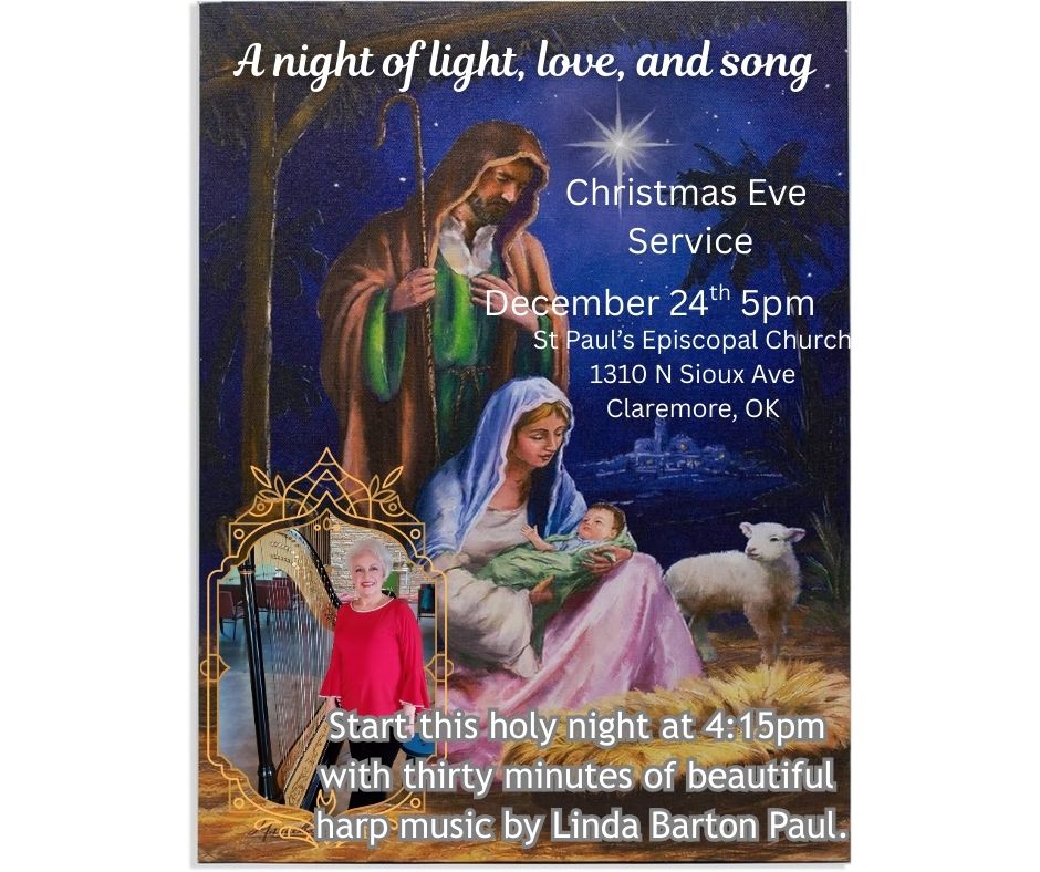 Our annual Christmas Eve service is just around the corner. This year, our very own Deacon Emeritus, Linda Barton Paul, is offering a free 30-minute harp concert beginning at 4:15 pm on Wednesday, December 24. After the concert, we will celebrate Holy Eucharist beginning at 5:00 pm. So, load up all your friends and relatives and join us as we, once again, welcome the Christ child!